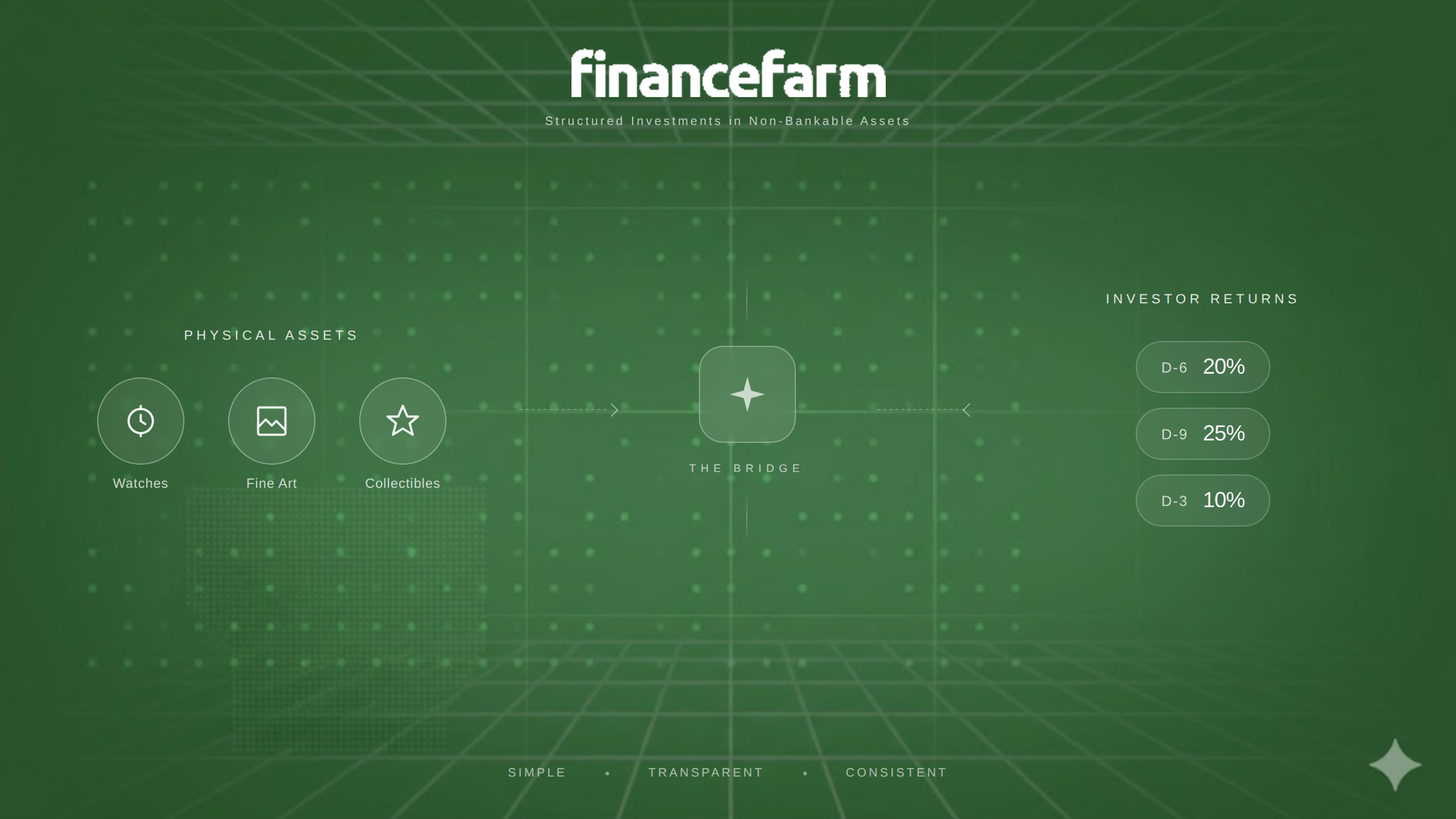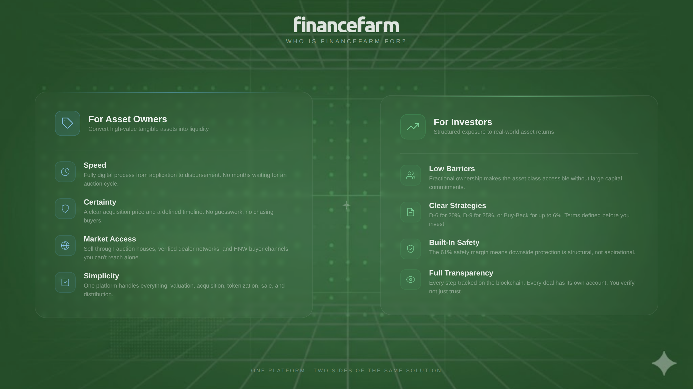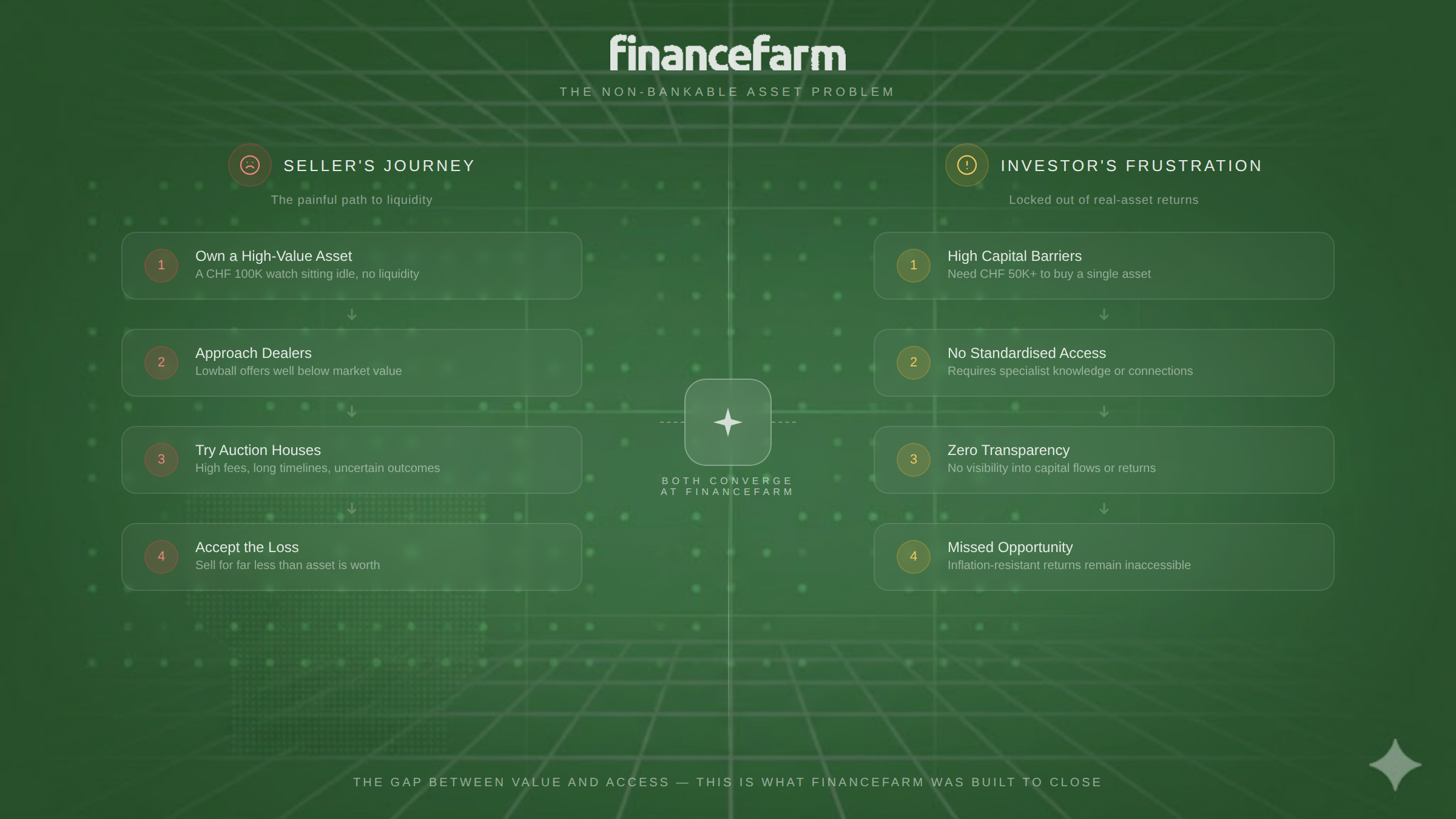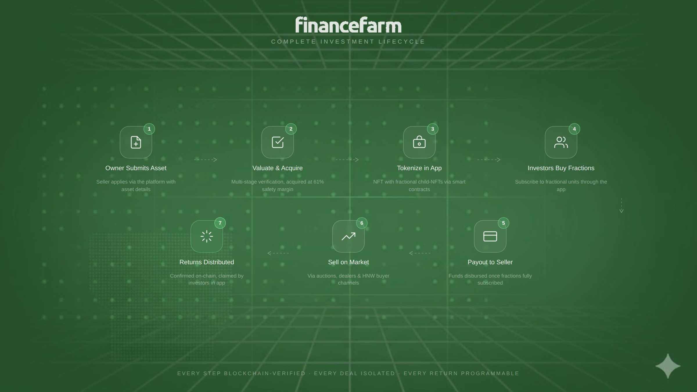 The fundamental issue is infrastructure. There is no single system that handles the entire lifecycle of a non-bankable asset transaction: rigorous valuation, disciplined acquisition, investor participation, market sale, and transparent distribution of returns. This gap between the value locked in these assets and the ability to access it efficiently is exactly what FinanceFarm was designed to close.