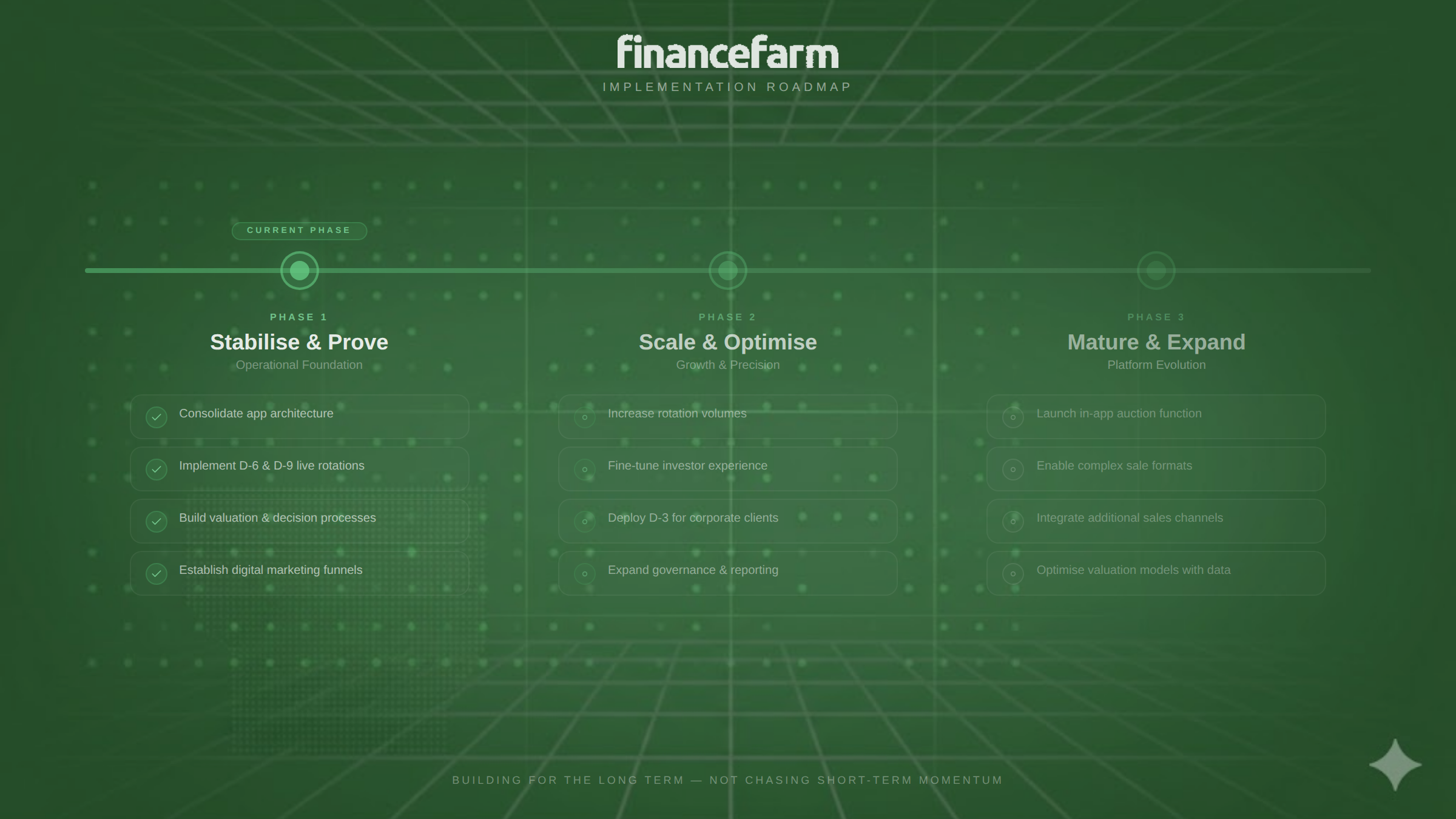 Phase 1: Operational Stabilisation. The immediate priority is consolidating the app architecture, fully implementing D-6 and D-9 rotations in live operation, building robust valuation and decision-making processes, and establishing digital marketing funnels. The objective is to deliver a reliable proof of execution and complete the first cycles with high process quality.