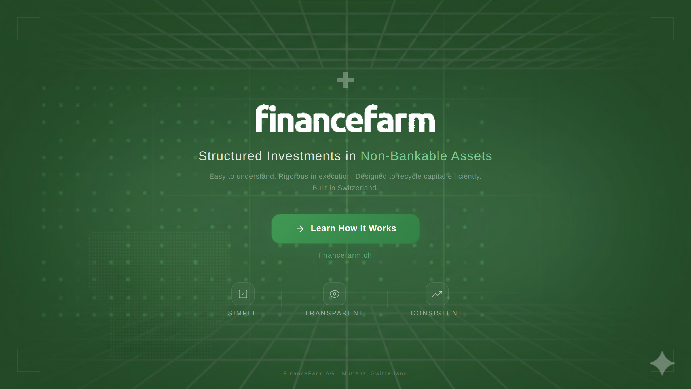 FinanceFarm AG, Muttenz, Switzerland. Structured investments in non-bankable assets. Simple. Transparent. Consistent.