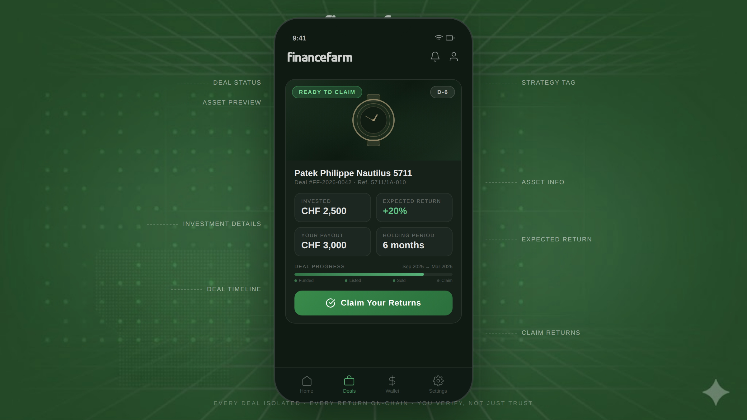 Receive Returns. When FinanceFarm sells the underlying asset on the open market, the sale payment is recorded in the bank account and confirmed on the blockchain. The investor then triggers their return claim directly in the app. The smart contract automatically allocates the corresponding amount to the investor's wallet.