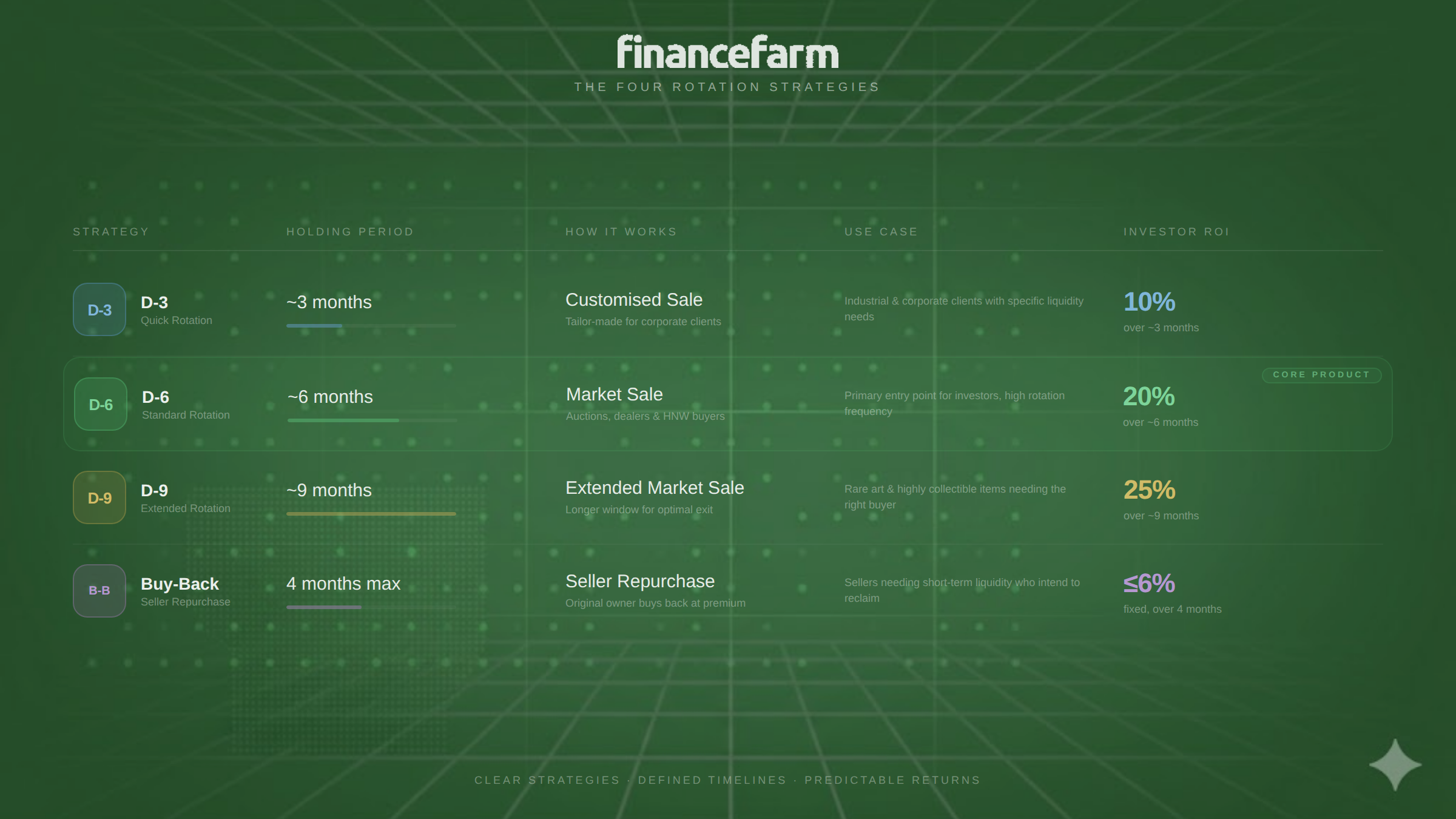 FinanceFarm operates four distinct rotation strategies that define how assets are held, how they are sold, and what returns investors can expect. Each strategy serves a different use case and investor profile.