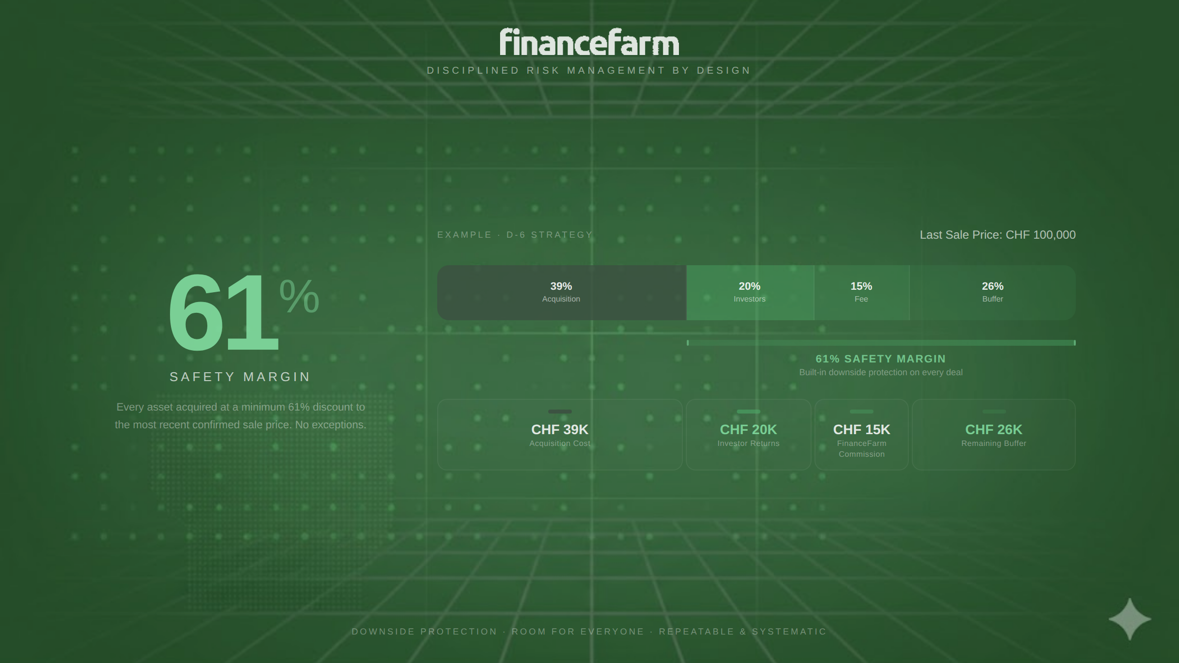 Every asset FinanceFarm acquires must demonstrate a minimum safety margin of 61% compared to the most recent confirmed sale price. In practical terms, if a luxury watch last sold for CHF 100,000, FinanceFarm will only acquire it at CHF 39,000 or less.