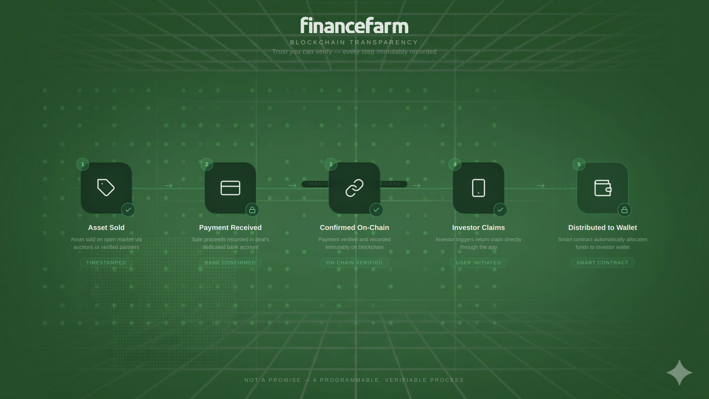 For investors, FinanceFarm provides structured access to real-world asset returns through a process designed around clarity, safety, and verification.