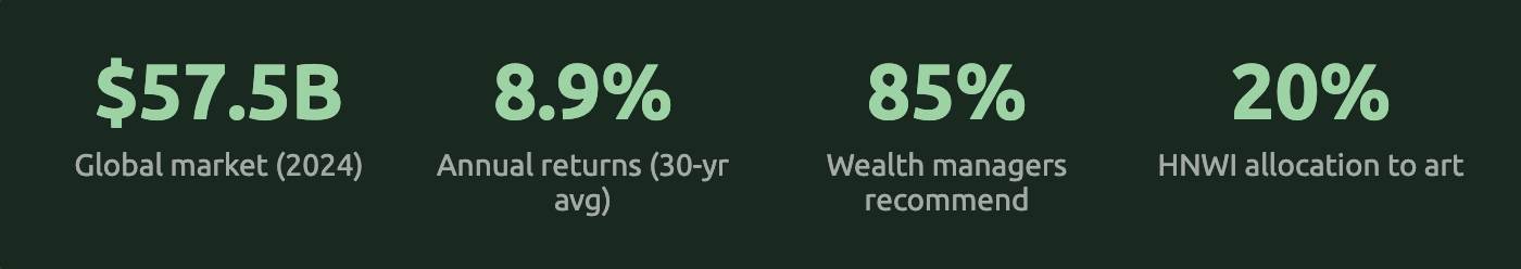 High-net-worth individuals (HNWIs) now allocate approximately 20% of their portfolios to art and collectibles, up from 15% in 2022, per the Knight Frank Wealth Report 2025. The demand is surging. The access is not.